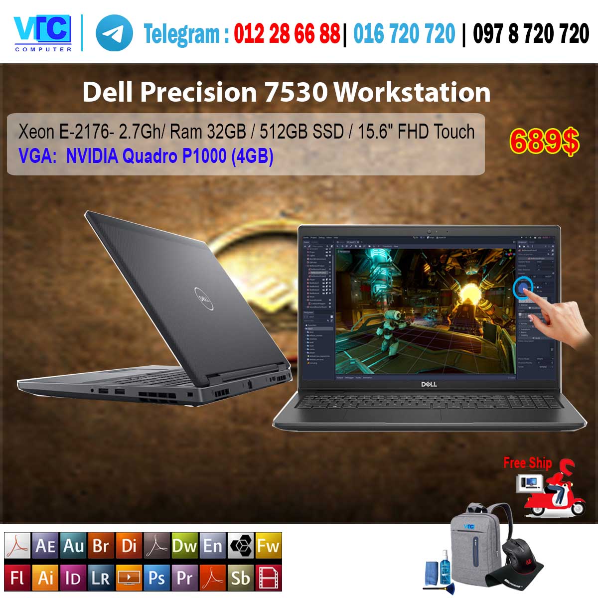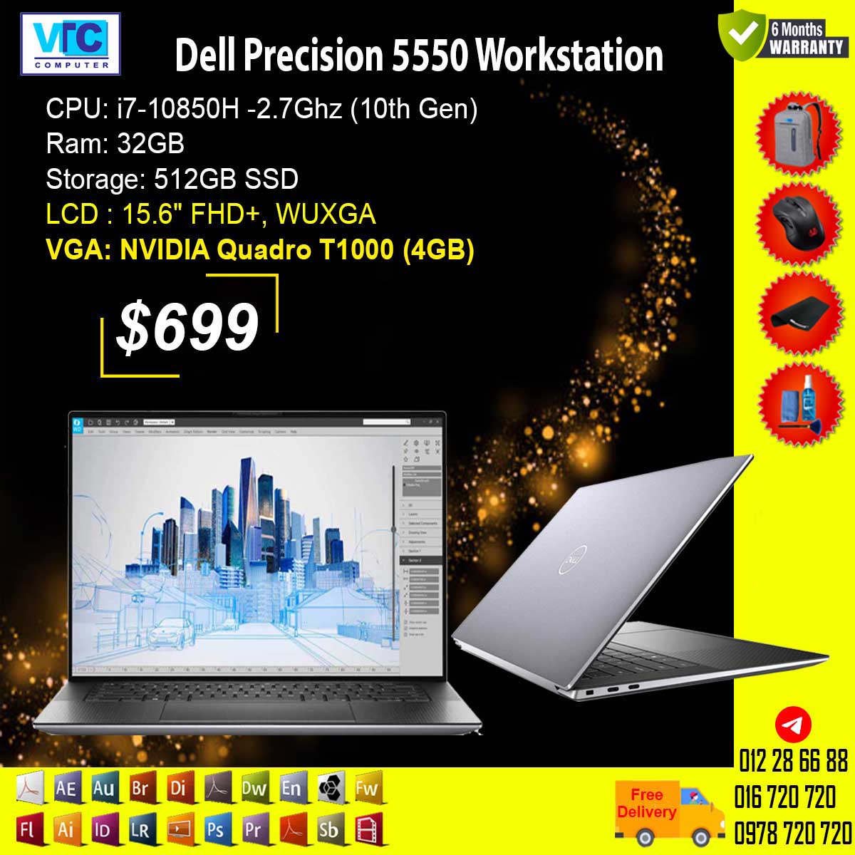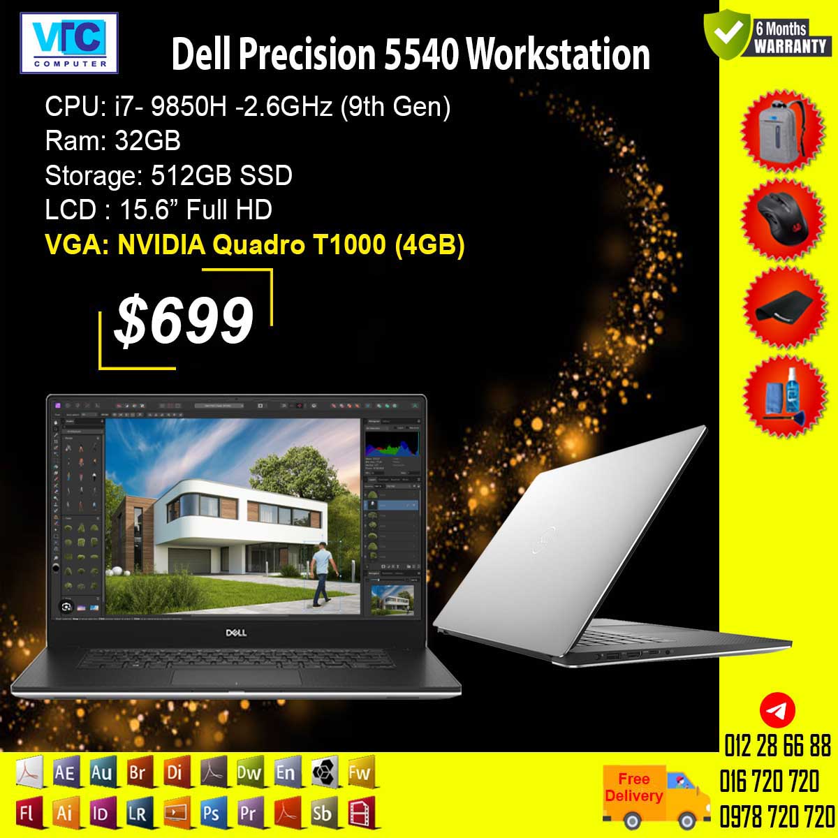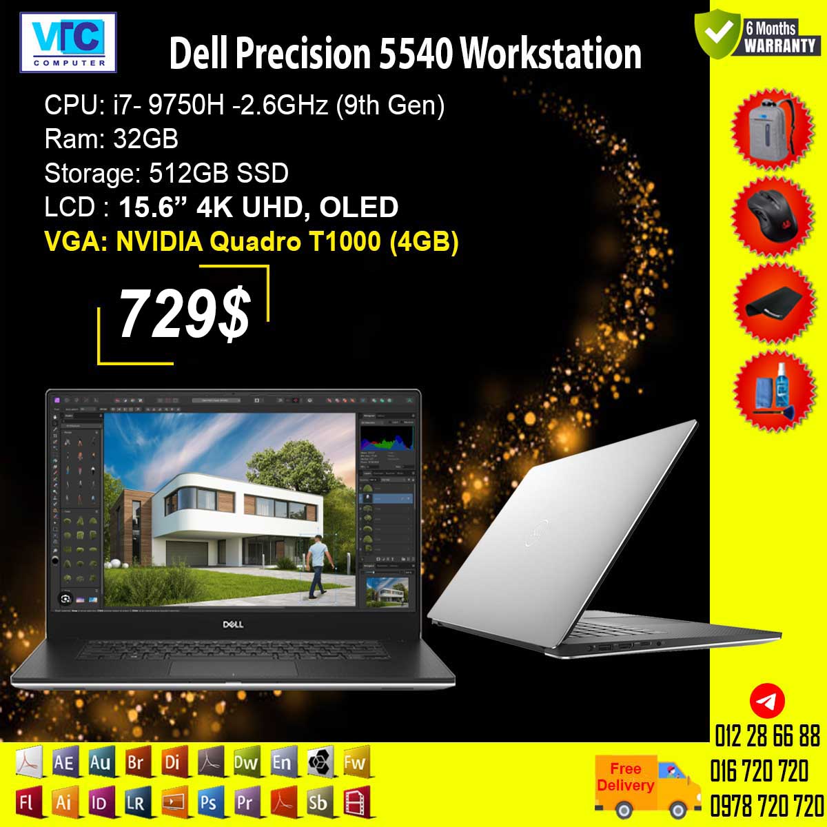 i7- 9850H (9th Gen)/ Ram: 32GB / 512GB SSD /15.6” 4K UHD Touch, OLED/ NVIDIA Quadro T1000 (4GB